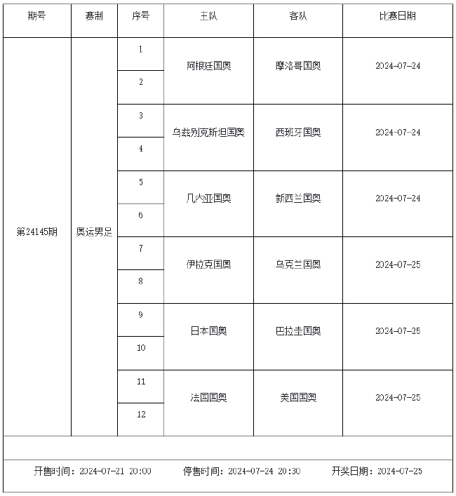 我中心制定了2024年中国足球彩票胜负游戏(14场、任选9场)、6场半全场胜负游戏和4场进球游戏7月19日-7月25日的竞猜场次安排(具体附后),其竞猜对象、开售时间、停售时间和计奖时间均以本文为准。