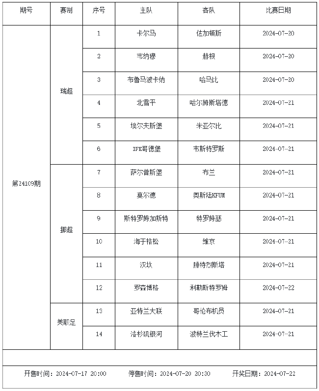北京时间7月16日,国家体彩中心公布了7月19日-7月25日足彩赛程,7月20日(周六)、7月24日(周三)共2期停售。其中第24109期由瑞典超、挪超、美职组成;第24110期竞猜奥运男足、奥运女足以及欧冠资格赛,以下为详细通知: